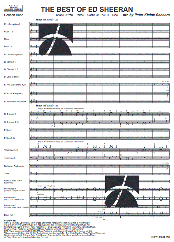 Aanvullende informatie/inhoud Ed Sheeran bestormt al enkele jaren de hitlijsten. Zijn aanstekelijke deuntjes en positieve stemmingsliedjes domineren sindsdien de internationale hitlijsten. Deze medley van de bekende Nederlandse arrangeur Peter Kleine Schaars bevat: