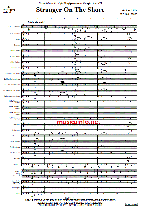Stranger On The Shore - klik hier Stranger On The Shore (harmonieorkest; oder; fanfare; klarinet in Bb), partituur