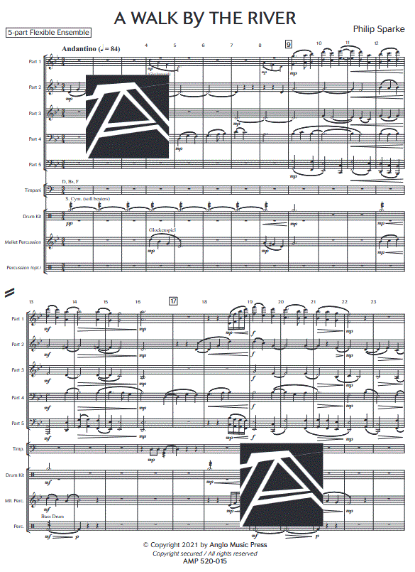 A Walk by the River - klik hier A Walk by the River (variabele bezetting; (5)), partituur en delen