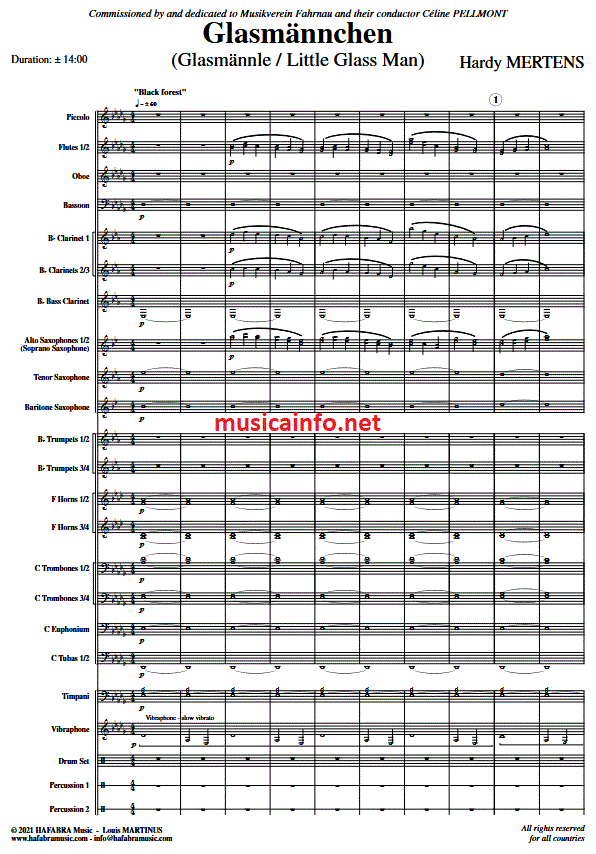 Aanvullende informatie/inhoud "Glasmännchen" ("Glasmännle"/"Kleine Glazen Man") is een opdracht van Musikverein Fahrnau. "Glasmännchen" is geïnspireerd op het sprookje van het Zwarte Woud van Wilhelm Hauff en de visie van Céline Pellmont op de helende krachten van regenval en vogels. De wereldpremière vond plaats op zaterdag 26 november 2022 @ Stadthalle Schopfheim. Uitvoerenden: Musikverein Fahrnau onder leiding van Céline Pellmont. Bereid u voor op contrasterende klankschilderingen van het Zwarte Woud, de geest van de Kleine Glazen Man en de vervulde wensen van de muzikanten voor volharding, intimiteit en vrijheid richting het gelukkige einde.....