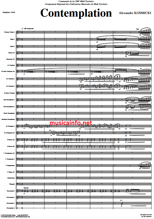 Aanvullende informatie/inhoud Alexandre Kosmicki's Contemplatie is meer dan een muzikale reis; het is een uitnodiging tot innerlijke contemplatie en zelfreflectie. De verschillende tempo's, stemmingen en stijlen illustreren de complexe werelden van gedachten en gevoelens die contemplatie met zich meebrengen. Het werk biedt niet alleen een diepgaande luisterervaring, maar ook een kans voor de muzikanten om hun technische en emotionele bereik te benutten. Het herinnert ons eraan dat muziek een van de puurste vormen van reflectie is: een contemplatie over de wereld en het zelf.