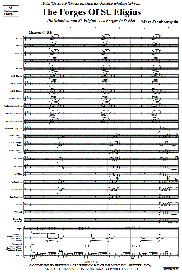 Aanvullende informatie/inhoud Ter ere van hun 100-jarig bestaan ​​gaven de gemeente Schmitten (Zwitserland) en haar muziekvereniging, de "Schmitten Music Society", opdracht voor een feestelijk concertstuk. Componist Marc Jeanbourquin liet zich inspireren door het wapen van het dorp ter ere van de beschermheilige van de smeden, Sint-Elooi. De titel van het werk is afgeleid van het feit dat de naam van de gemeente letterlijk "De Smidse" betekent. Na een majestueuze ouverture is de rest van het stuk gebaseerd op een koraal begeleid door energieke ritmes. Het beeld van de smid is ook aanwezig, met percussie die lijkt op die op het aambeeld. In "De Smidse van Sint-Eligius" zullen de melodieën ongetwijfeld tot het einde van het concert in de oren van het publiek blijven hangen.