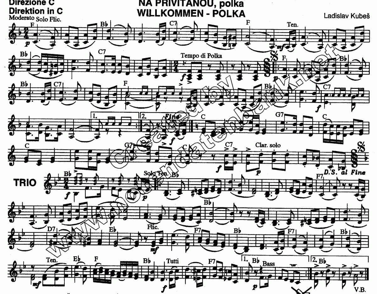Na Privitanou (Willkommen-Polka) - klik hier Na Privitanou (Willkommen-Polka) (harmonieorkest), Samenvatting van de partituur en stemverzameling